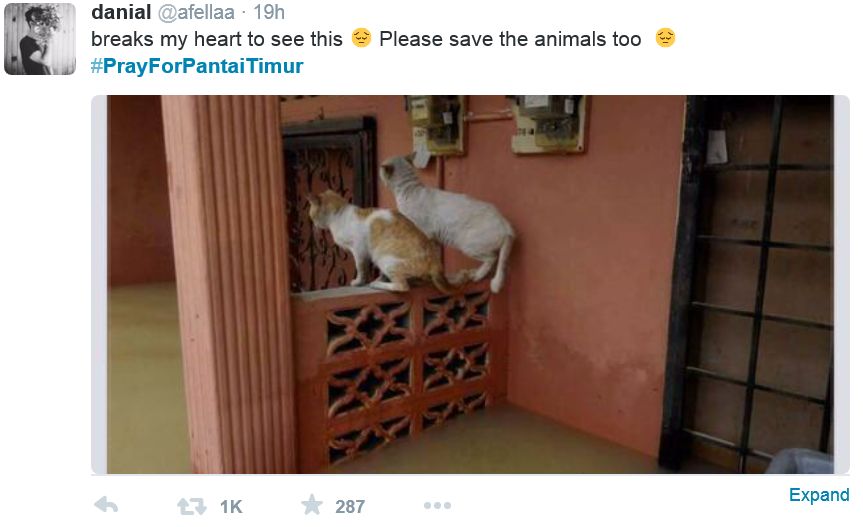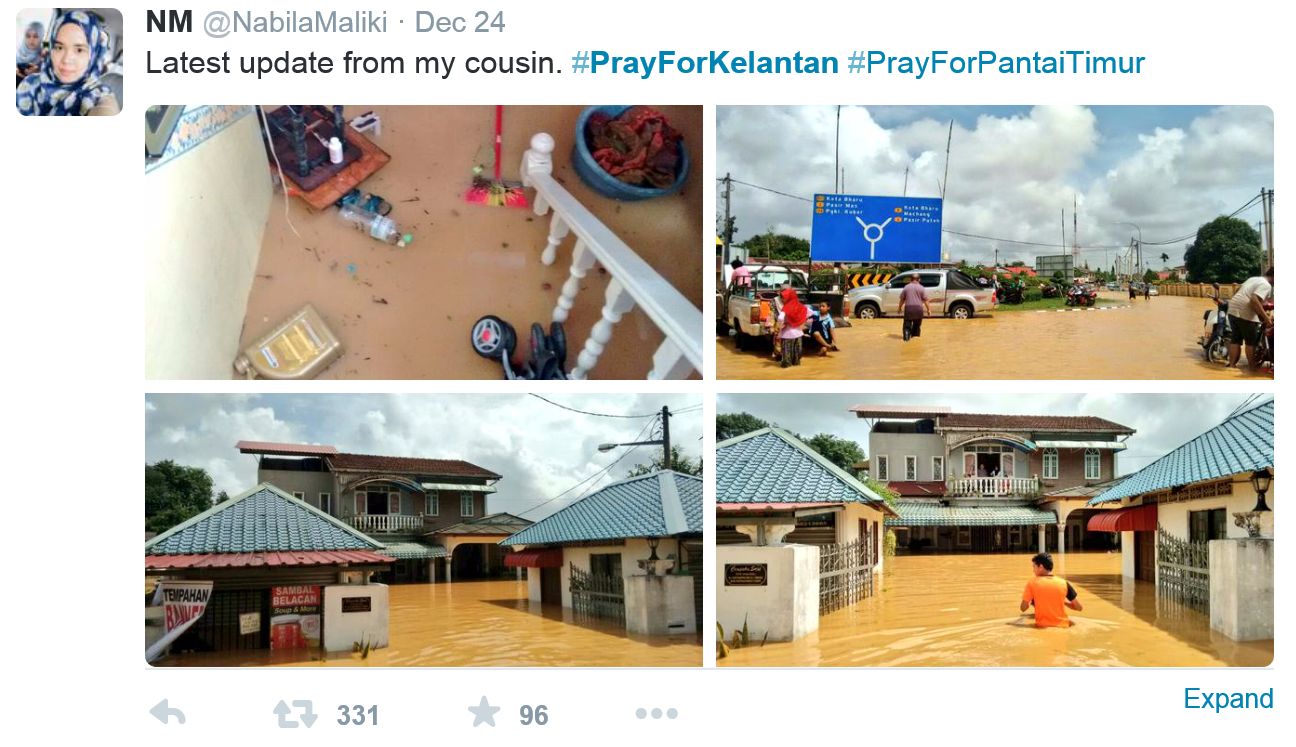 Daripada gambar – gambar rumah dan bangunan yang diselubungi oleh air coklat, gambar orang merendah air banjir untuk mencari makanan, kepada gambar haiwan berlumba-lumba untuk mencari kawasan yang lebih tinggi – telah membanjiri di platform sosial media terutama di Twitter untuk meminta bantuan dan doa dengan menggunakan hashtag #PrayForPantaiTimur dan #PrayForKelantan.